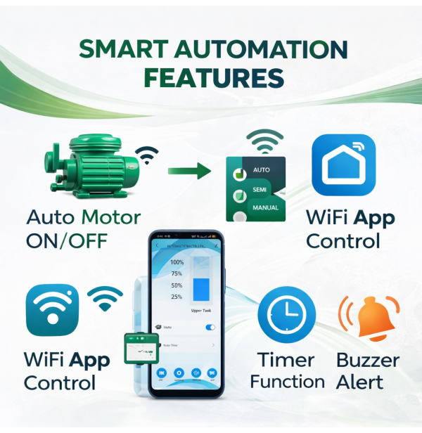- Motor can be manually turned ON or OFF using the Green Push Button or Mobile App.