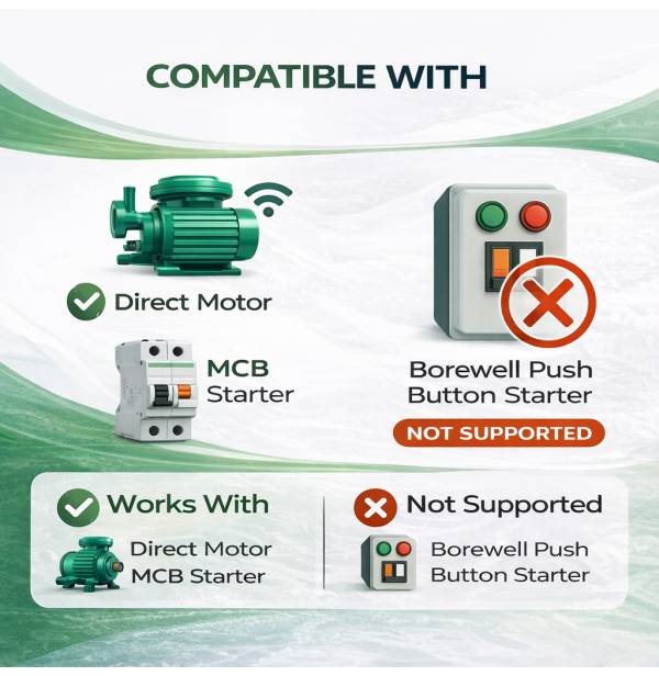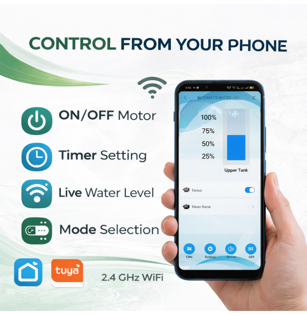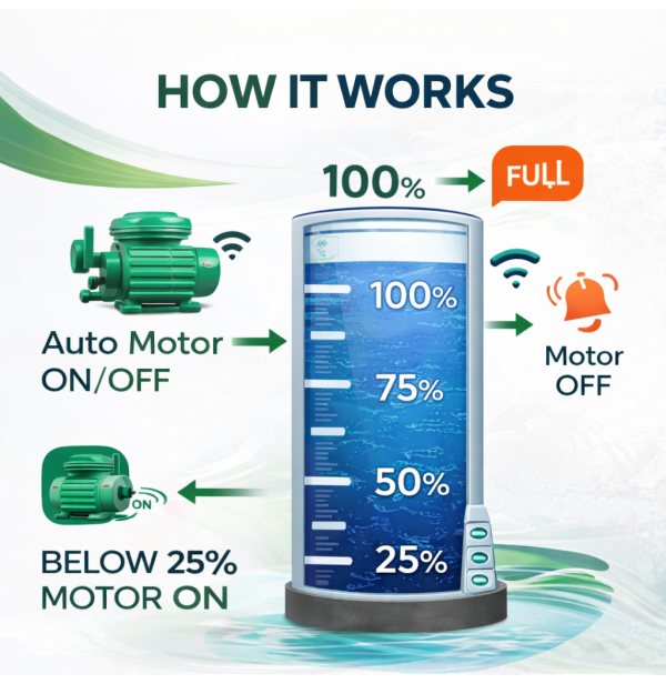 - Motor stops automatically when overhead tank is full (100% probe submerged).